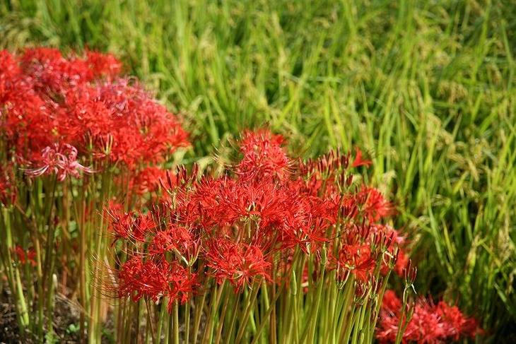 田んぼの、あぜ道では彼岸花が見頃を迎えています。