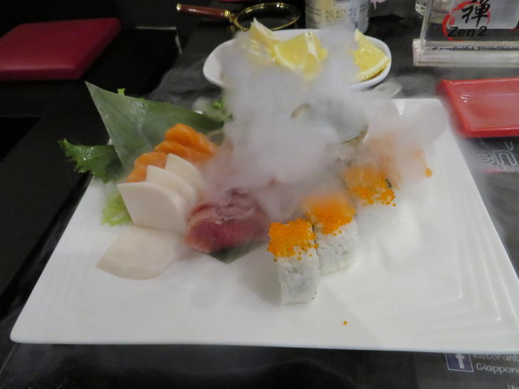 エビフライ入りのウラ巻きと刺身の盛り合わせ!(ドライアイス付きで登場しちょっと見えるかなあ。。。笑)