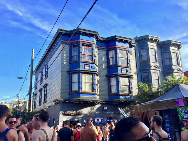 フォルサムストリートフェアはゲイフラッグ(6色のレインボーフラッグ)とは別にブルー・黒に赤いハートのフラッグがある。 そのカラーリングされた外観のお家を見つけた。