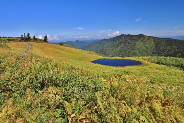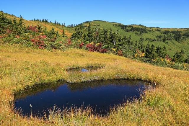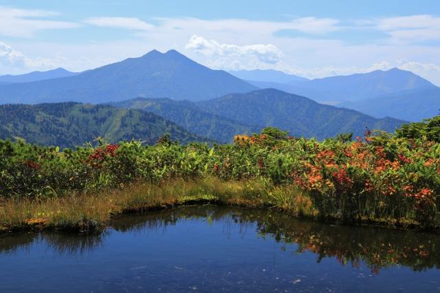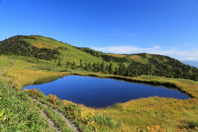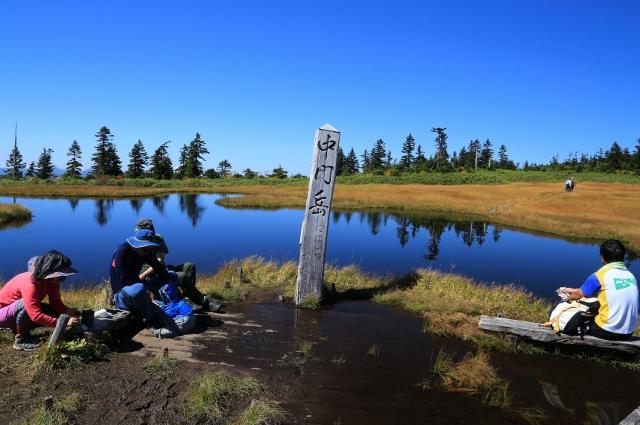 中門岳の山頂手前にある大きな池塘は、澄み渡る天空を映します。