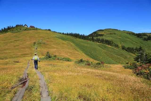 展望ベンチを過ぎ、駒の小屋と会津駒山頂を望みながら美しい草原を進みます。