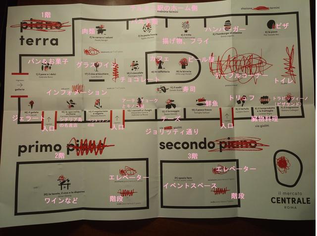 ↑ “ローマ中央市場”の公式ホームページもありますが(こちら)、やや分かり辛いので紙の地図を貰って来ました。地図上にお店の名称の日本語訳を入れました。今現在(2017年9月29日)入居している店舗ですので、将来的にお店が閉店になったり、新しいものが入ったり、状況が変わることもあるかもしれません。とは言っても、大体のお店の種類が分かると思いますので、ご参考にどうぞ!!