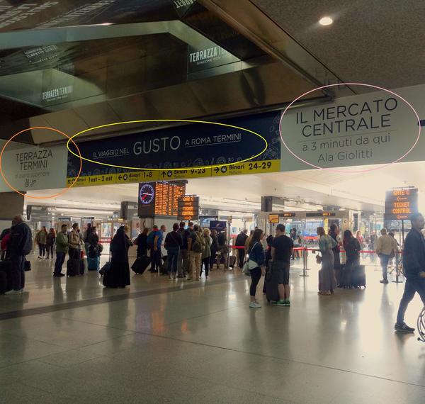 ↑ こちらの看板をご覧下さい。テルミニ駅の列車が出発するホームの前に掲げられた広告を数日前に撮影したものですが、テルミニ駅は最近、”テルミニ駅のテラス”(看板左側のオレンジ色の丸で囲ってある部分)と”ローマ中央市場”(看板右側のピンクの丸で囲ってある方)の2ヶ所の大きなお食事処(フードコート)がオープンしました。現在、お食事処の宣伝中です。(看板中央の黄色の丸の部分)