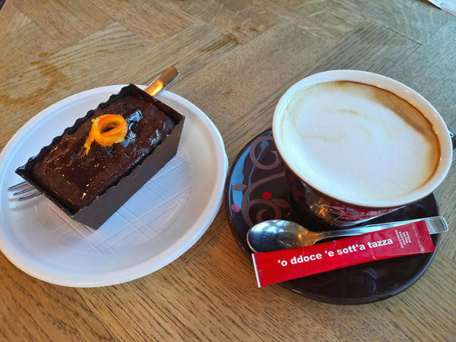 ↑ お食事街「テルミニ駅のテラス」のとあるお店で、”ビターなオレンジのチョコレートケーキ”と言うデザートを試してみました。飲み物はカプチーノです。