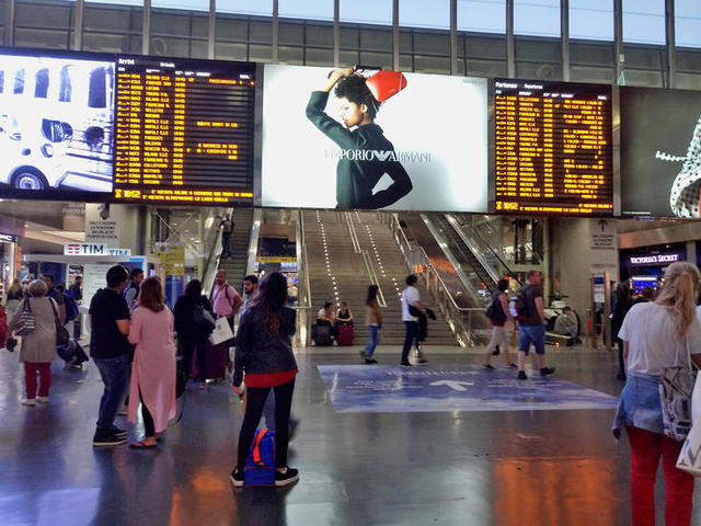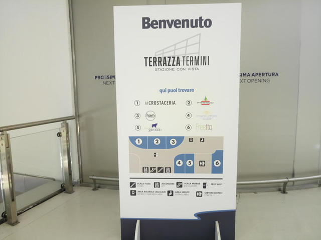 ↑ テルミニ駅の丁度中央辺りに、大きな電光掲示板(出発/到着)が設置されています。その掲示板の後ろに新しく出来たエスカレーターを上ると「テルミニ駅のテラス(Terrazza Termini)」があります。いつも人でいっぱいの場所です。それでは行ってみましょう!