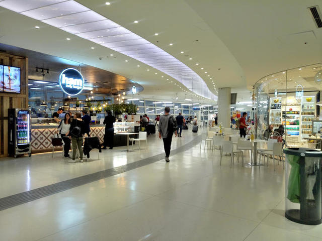 ↑ エスカレーター手前の床面の表示には、バール/レストランが6店舗、携帯電話の無料チャージコーナー、無料Wifiサービス、トイレがありますと案内があります。