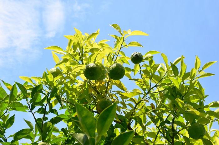 今回収穫したゆずは青ゆずといって、黄色くなる前のゆずです。冬のゆずとは違ってさっぱりした味わいです。枝にはとげがたくさんあります。