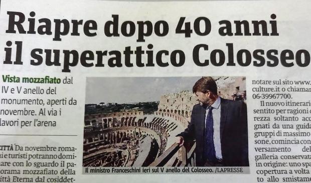 ↑ 40年ぶりのアッティコ(屋階)オープンを知らせる昨日10月5日の新聞記事(メトロ・ニュース)。イタリアの美術館、博物館、遺跡などを管理している文化財・文化活動と観光省(Ministero dei Beni e delle Attività Culturali e del Turismo)のフランチェスキーニ文化相が5レベル部分に立っているところです。とても怖いです!(高さが)