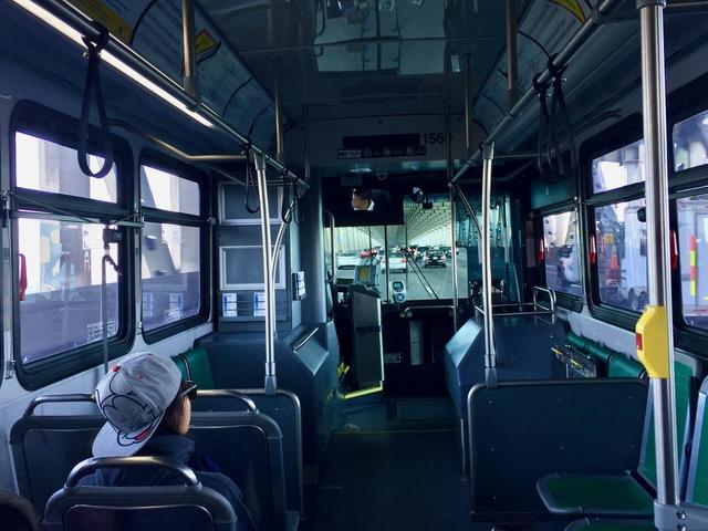 路線バスなので、車内はミュニバスとほとんど同じ、出発して直ぐにベイブリッジに乗る。 サンフランシスコ側は5車線の2階建ての橋でアウトバンドは下の車線を走る。