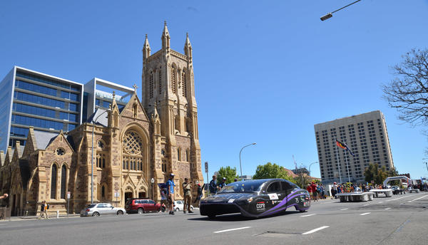 一般車とまったく違う形状のソーラーカーが公道を走る!というだけでも驚きなのです。このレースの名前にチャレンジとついていること。何がチャレンジなのか、オーストラリアの地図を広げてみてください。大きな大陸の一番上(北)に位置するのがノーザンテリトリーのダーウィン、そこから南に下りてきて南オーストラリア州のアデレード、この間3000kmをできるだけ早く完走するレースです。