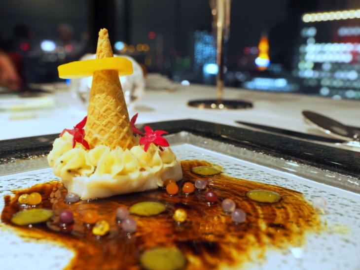 「北海道産豚肉のパテ・ドカンパーニュと黒トリュフ入りサツマイモのピューレ さっぽろテレビ塔の夜景仕立て」