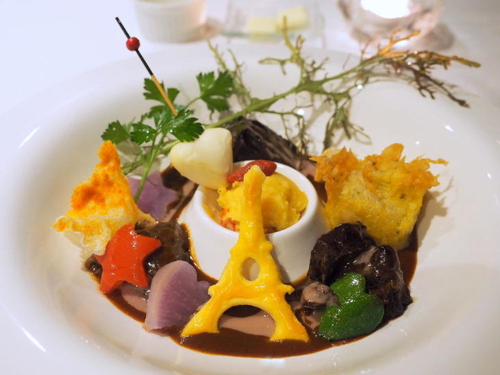 “北海道産牛ホホ肉のシチューとフォワグラのベニエ 夜景をイメージして”