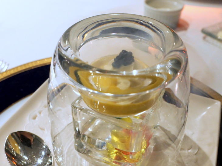 「液体窒素で仕上げるアミューズ ユリネのピューレ キャビア 南瓜のスープ」