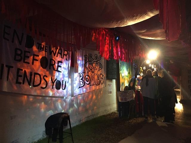 最初に手荷物検査を受けてから、チケット窓口へ・・・もう入った途端に、反戦スローガンやサイケデリックなイラストのポスター、それに別名フラワーチルドレンとも自称したヒッピーたちの写真が、壁に一杯!