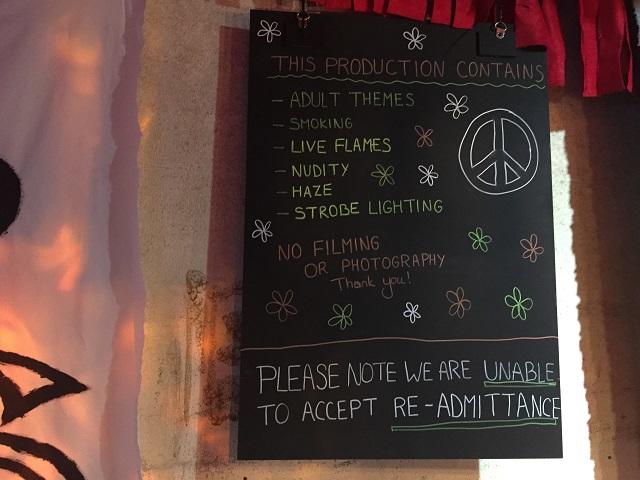 チケット売り場には、こんな黒板の注意書きが。大人向けの内容であること、喫煙シーンや火を使うシーン(お香・キャンドル・ドラム缶の焚火など)もあり、またほんの一瞬だけど出演者全員が全裸になるシーンもある等。同劇場のウェブサイトには「14歳以上向き」とも書いてありました。