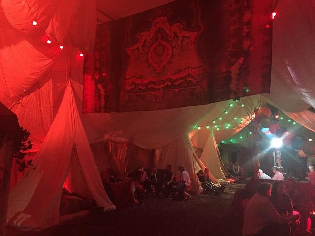 カラフルなテープで彩られた、手作り感あふれるゲートが目印。収容人数190人ほどの規模といい、「アングラ劇場」という形容が似合う雰囲気。
