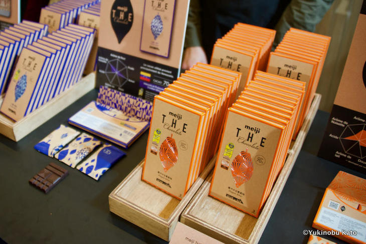 まず目につくのが日系パティスリーおよびメーカーの多さ。じつは2017年のサロン・デュ・ショコラは、日本が招待国として焦点が当てられています。サダハルアオキ、トーキョー・チョコレート、エスコヤマといった常連の他に、「ザ・チョコレート」の売り上げが日本で好評な明治が、大きなブース展開をしています。