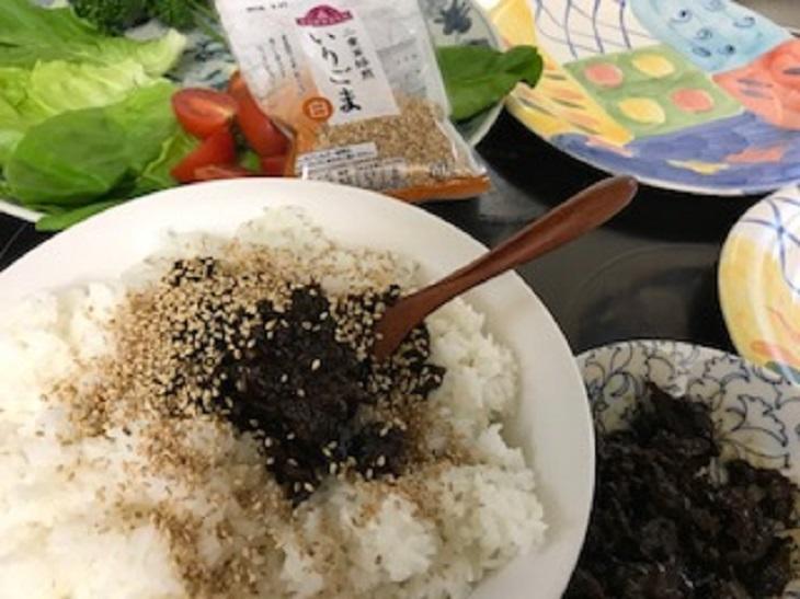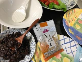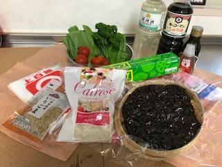 (手前左から)砂糖、いりごま、カルローズ(お米)、あさり時雨煮(しぐれに)、豚肩ロースしゃぶしゃぶ用。