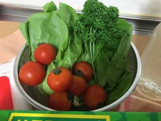 (奥左から)サラダ菜、プチトマト、パセリ、料理酒、醤油、はちみつ、オリーブオイル。