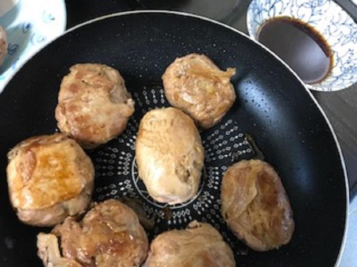 (巻いたお肉が均等に火が通るよう、フライパンの上でおにぎりを転がしながら焼いていきます。)