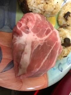 (しゃぶしゃぶ用薄切りの豚肉でおにぎりを巻いていきます。1つにつき、大2枚位(約30~50g)。)