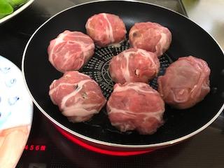 (熱したフライパンにオリーブオイルをなじませ、おにぎりを巻き終わった豚肉のつなぎ目を下に置いていきます。)