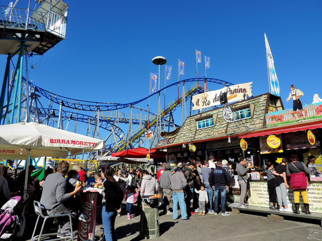 ↑ 遊園地には、小さな乗り物が3~4個ある程度かと想像していましたが、ジェットコースターなどもある本格的なものでした。丁度今はお昼ご飯の時間な為、パニーノの屋台には沢山の人がいました。この日は良く晴れた暖かな日で、多くの親子連れが遊びに来ていました。