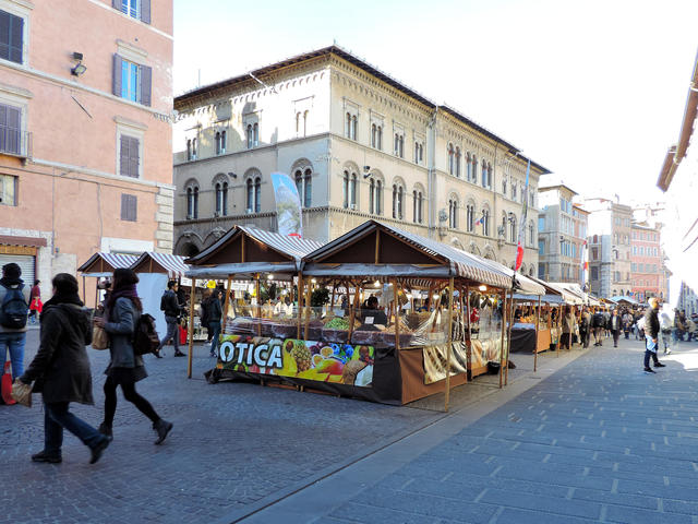 ↑ 目抜き通り、ヴァンヌッチ通りの一本東側の通りです。通りに面して、ペルージャ中央郵便局があります。こちらにも様々なお店が出ています。一番手前の屋台では、おいしそうなドライフルーツが売られていました。