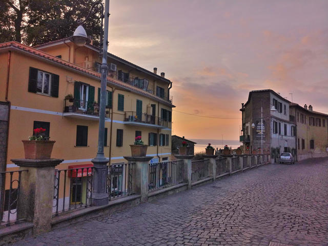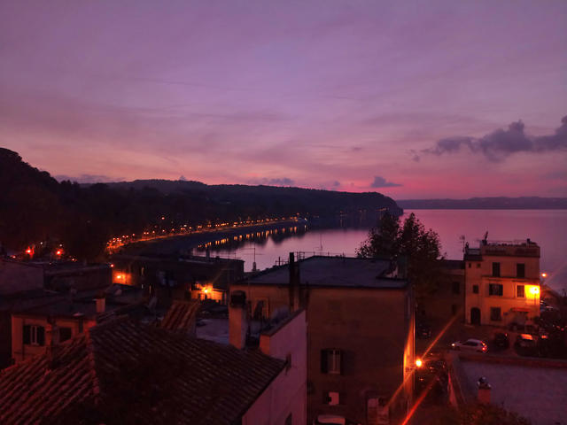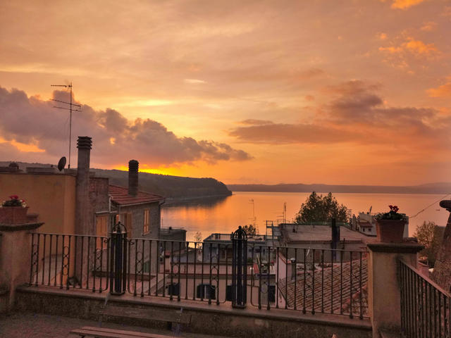 駅から車でブラッチャーノ湖の畔のアングイラーラ・サバツィア(Anguillara Sabazia)という町へ行きます。車を駐車すると、もう民家の間から夕暮れ時の湖の素晴らしい景色が見えました。