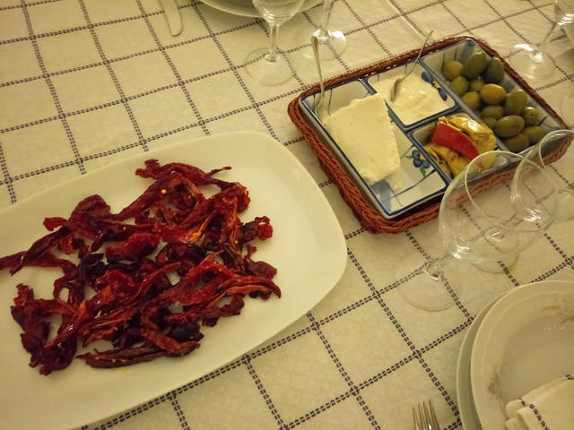 ↑ 少しだけ、夕食の前菜の模様をお届けします。手前はイタリア南部で作られた干し赤ピーマンです。カリカリとして、ビールやワインのお摘みにもとても良いです。そして、イタリアには非常に多くの種類のチーズがありますが、前菜ではフレッシュチーズのブッラータや、クリームチーズのストラッキーノがとてもおいしかったです。チーズはスライスして軽く焼いたパンなどに塗っていただきます。カナッペのイメージです。(写真の白いものがチーズ)