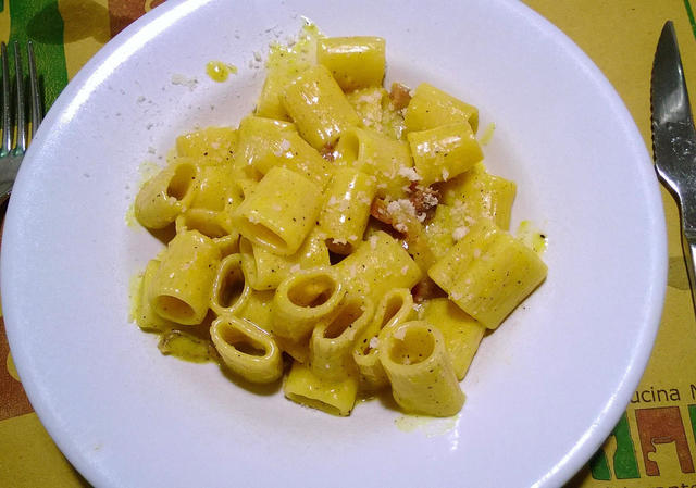 ↑ ローマ名物、カルボナーラです。ショートパスタを使用しています。