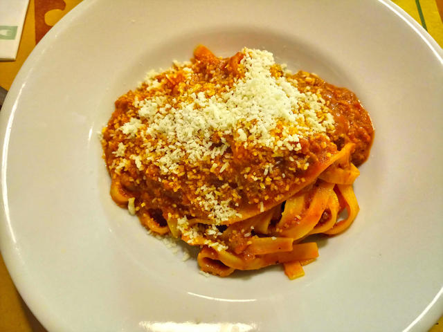 ↑ ミートソースのフェットチーネです。これはメニューにはなかった様に思いますが、筆者は急いでいたので、ウェイターさんにすぐに出来るものを適当に持って来てもらった時のものです。すみません!