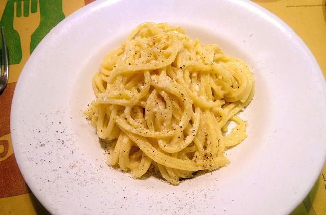 ↑ ローマ名物、カーチョ・エ・ペペです。カーチョはチーズ、ペペは胡椒のことで、この二つの材料だけを使って作るシンプルながらもおいしいパスタです。パスタに絡ませるチーズには、羊のお乳から作られるペコリーノ・ロマーノを使用します。
