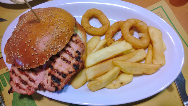 ↑ ハンバーガーが食べたいと言う人がいたので、一緒にハンバーガーにしました!フライドポテトとオニオンリング付きのチキンバーガーです。