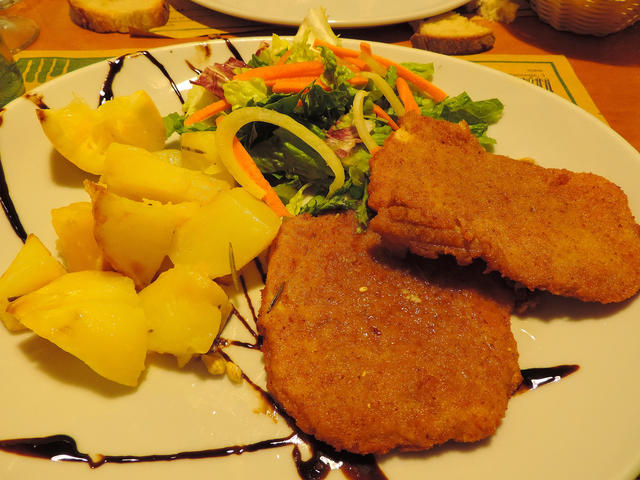 ↑ これはまた別の日に注文した、ミラノ風カツレツのオーブン焼きジャガイモとサラダ添えです。