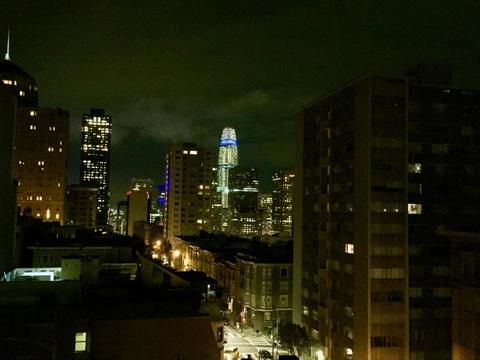 日の出時間が6:40なので日の出直前の空の色とセールスフォースタワー。