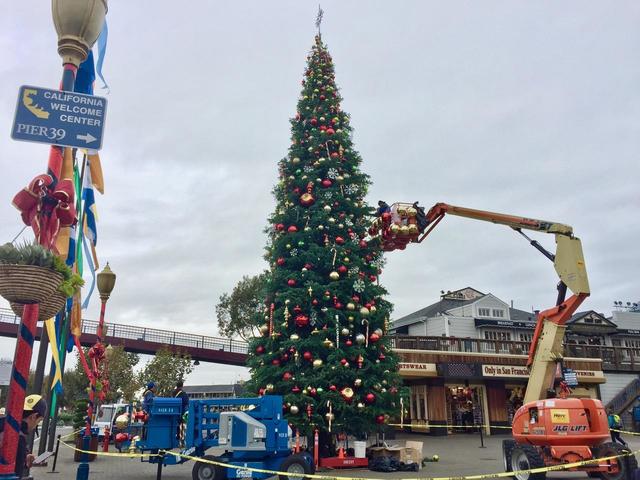 ハロウィン過ぎると一気にホリデーシーズン、クリスマスツリーの準備。 全米屈指の観光地『フィッシャーマンズワーフピア39』にも巨大ツリーが現れ、立ち入り禁止の黄色いテープ内で自ら運転する小型クレーンに乗ってクリスマスツリーの飾り付けをしてる。