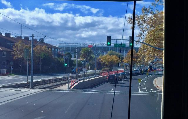 対向車線にはライトレイルが見える。 スタジアムができてすぐ来た時、カルトレインを乗り継ぎライトレイルでほとんど立ちっぱなしここまで来たのが嘘のような快適さだ。