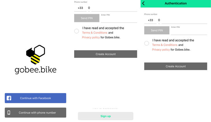 ゴービー・バイクの利用にはスマホへの専用アプリのダウンロードが必要です。ダウンロードしたらアプリを開きアカウント登録します。アカウントはフェイスブック経由または携帯の電話番号を使っての登録が必要です。フェイスブックのアカウントを持っていない人もいるかもしれないため、今回は電話番号を使って登録してみます。
