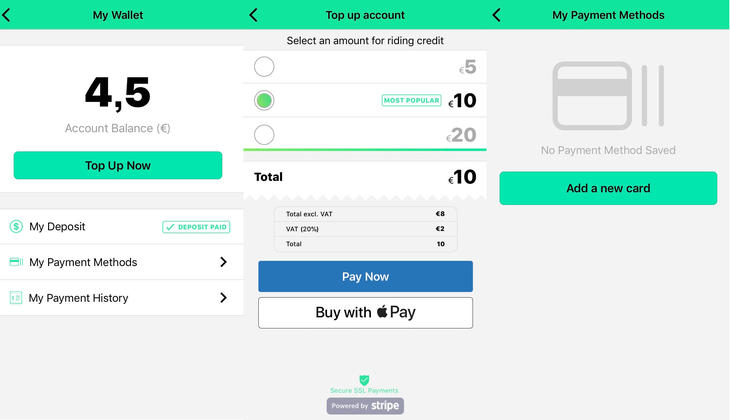チャージするには、「Top Up Now(今チャージする)」をタップ。次に「Select an amount for riding credit(入金額を選ぶ)」の画面が出てきます。「5ユーロ」「10ユーロ」「20ユーロ」という選択肢から、前払いしたい額を選びます。初回のみ、それら金額に加えてデポジットとして15ユーロが必要となります。つまり「5ユーロ」を選んだ場合、その5ユーロとデポジットの15ユーロで、合計20ユーロかかります。