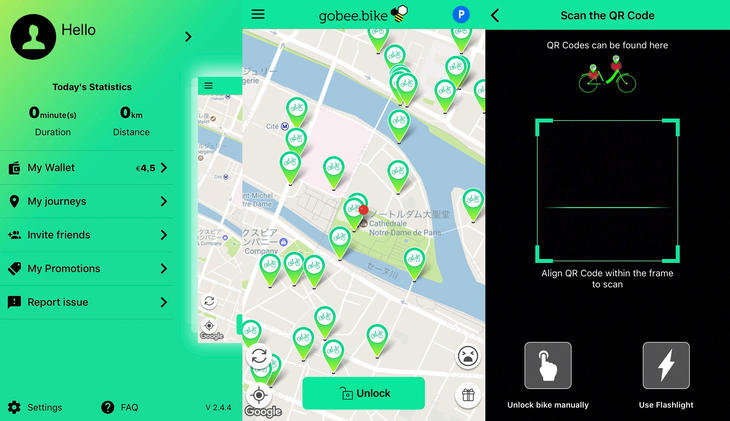 このシェアサイクルの良いところは、ヴェリブのようにステーション(駐輪場)に返さず、町中で乗り捨て可能という点(駐輪禁止の場所もあります)。そのためステーションが満車で、目的地周辺に着いたのに自転車をなかなか返却できないということがありません。また目的地でそのまま乗り捨てできるため、行きたいところまでピンポイントで自転車を使えます。今回はそのゴービー・バイクの使い方を説明していきます。