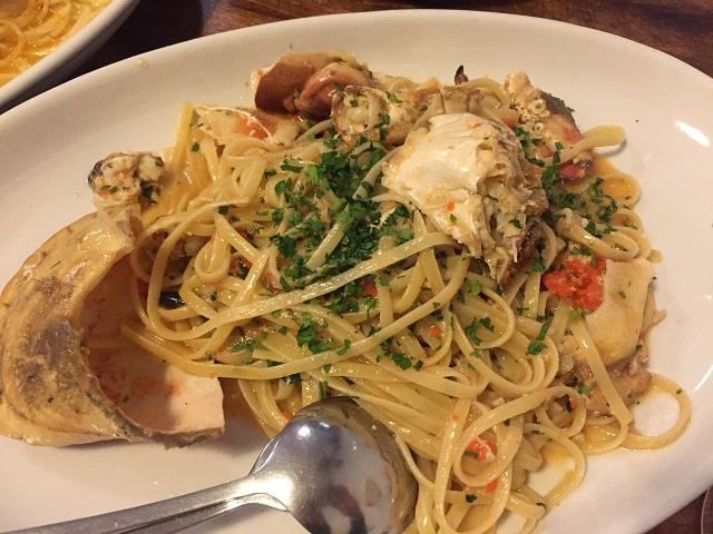 でもシーフードのパスタ類は、期待通りに美味しかった!まずは蟹のリングィーネ(Linguine al granchio)、赤いところのは蟹のタマゴです。ガーリックとチリが効いてて、ワインが進むお味~~。