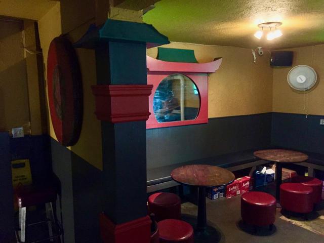 テーブル席(ラウンジ?)はこんな感じ。 チャイナタウンのダイブバー(Dive Bar)の色濃く。 椅子の下にビール箱を発見、こっそり持っていく人いないのだろうか? 案外規律が守られているようだ。