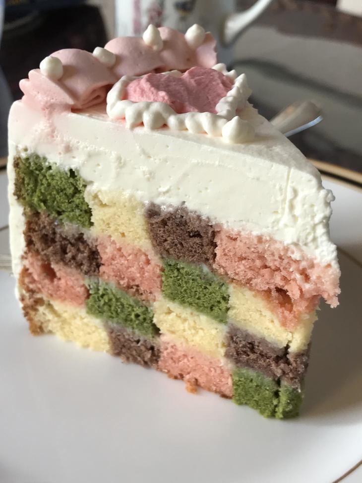 いくつも重ねるのでふわふわ生地では不安定、カットするのもちょっとだけ大変。でもカラフルで楽しいし、また作ろう!ホワイトチョコのガナッシュを組み立てに使ったけど、ジャムでもよかったな?ショートケーキバージョンは軽い食感です。