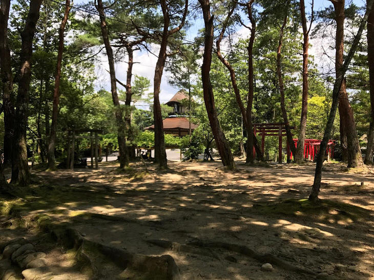 (上野公園内、木々の間・赤い鳥居の横に俳聖殿の姿がちらりと見える。)