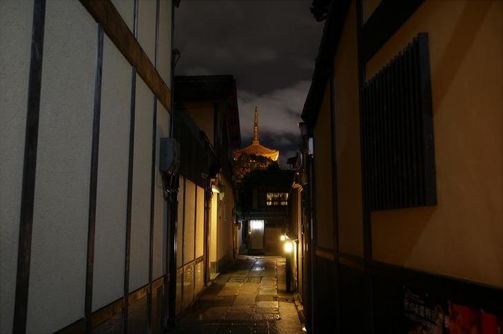 八坂通の細い道の奥に凛として建つ姿は、堂々としています。