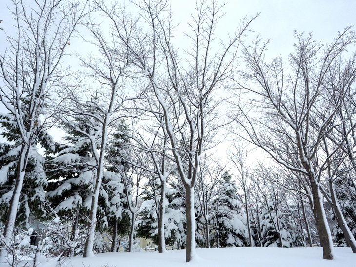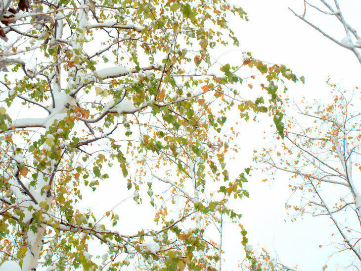 突然の降雪に、白樺にはまだ緑や黄色の葉が残ったまま。