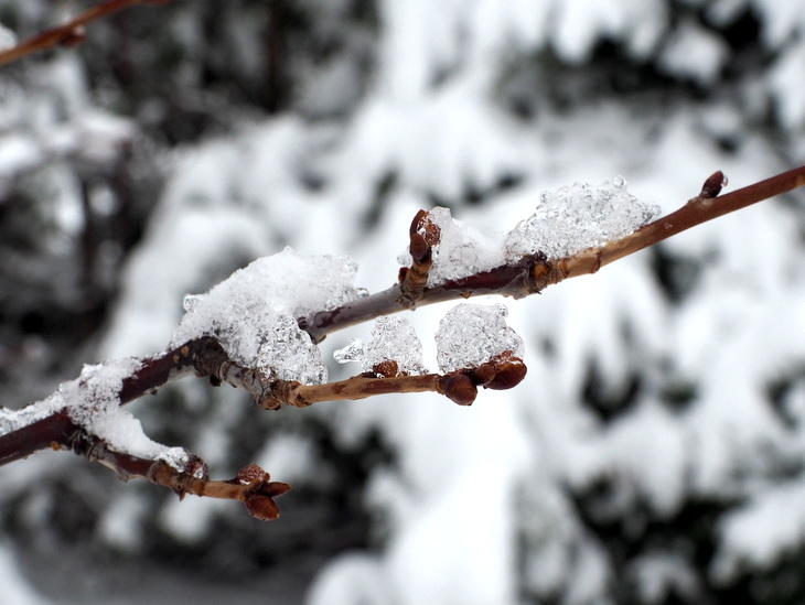 枝の冬芽は小さな氷で覆われ、氷中花のよう。