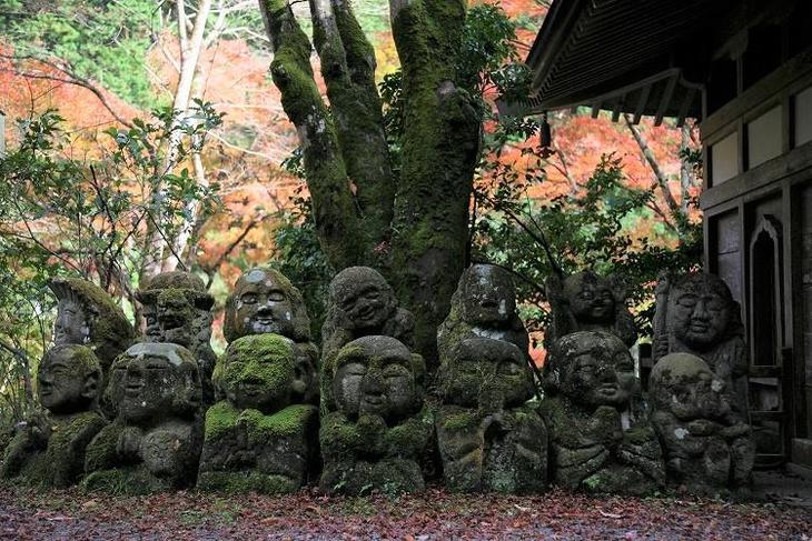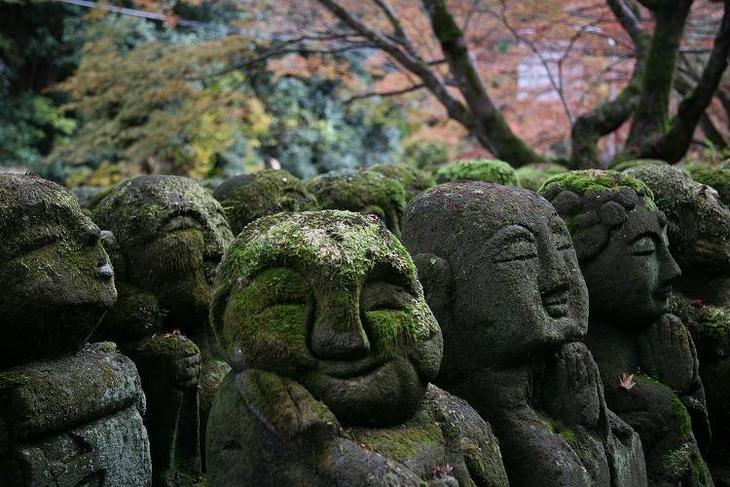 この時期の千二百体の羅漢様は、紅葉景色の中、苔に覆われています。
