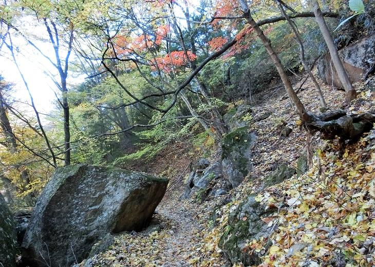 最初のチェックポイント「増富温泉」を過ぎると、遊歩道というには山道? というような細く舗装のない道をしばらく歩きました。